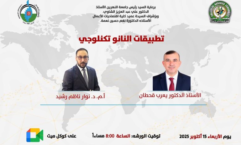 نظمت كلية اقتصاديات الأعمال في جامعة النهرين، بالتعاون مع مركز الأبحاث في جامعة جيهان – دهوك، ندوة علمية دولية (ويبنار) بعنوان “تقنيات النانو وتطبيقاتها وتأثيرها على الاقتصاد”، وذلك يوم الأربعاء الموافق 15 تشرين الأول 2025، بمشاركة أكثر من 100 باحث وأكاديمي من داخل العراق وخارجه، في خطوة تهدف إلى ربط البحث العلمي بالتنمية الاقتصادية المستدامة.