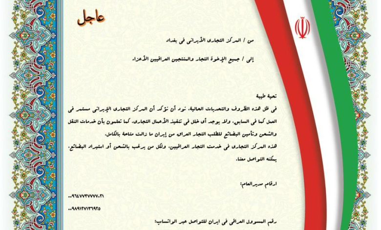 المركز التجاري الايراني في بغداد يؤكد استمرار نشاطه وتوفير خدمات الشحن للتجار العراقيين